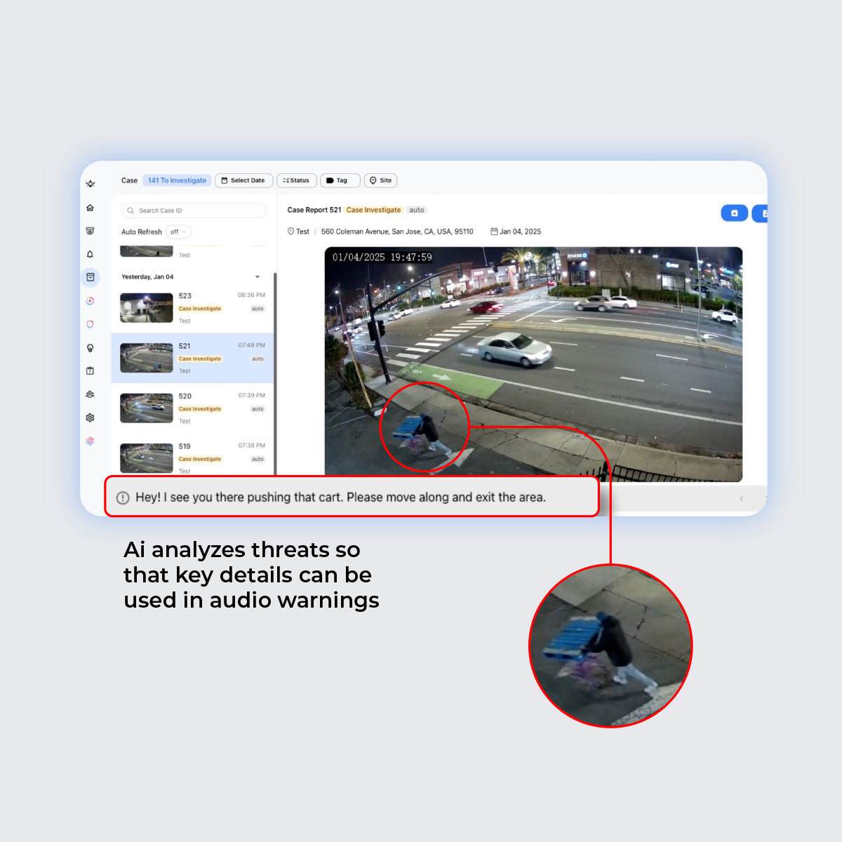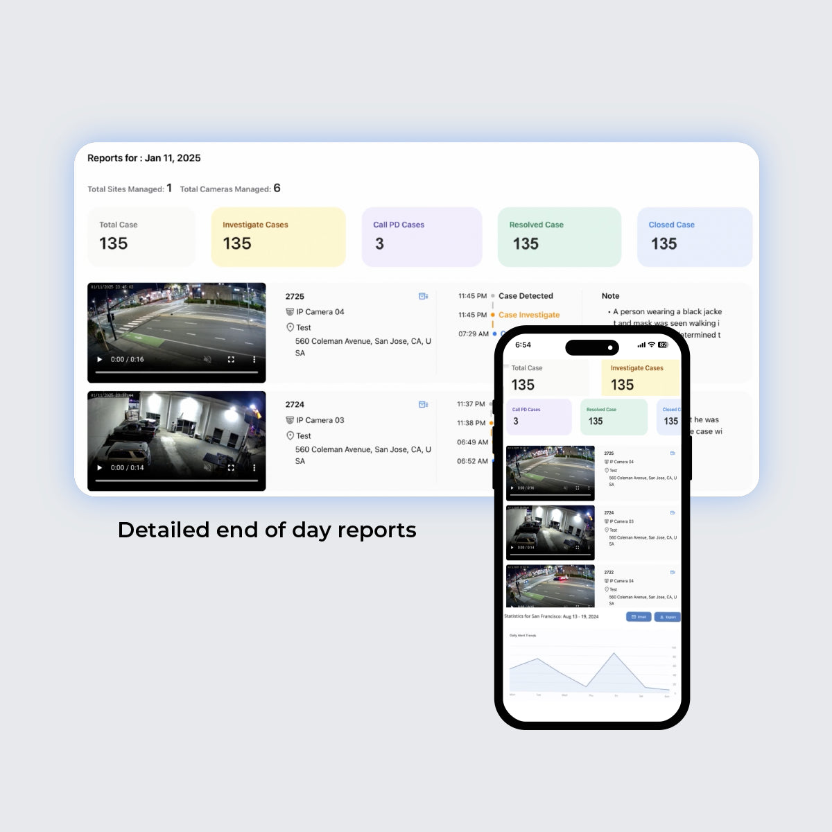 Simplify security incident reporting with automated case reporting and management. Our AI platform compiles critical event data, including video evidence and timestamps, into comprehensive reports, ready for internal review or sharing with law enforcement, streamlining your security operations.